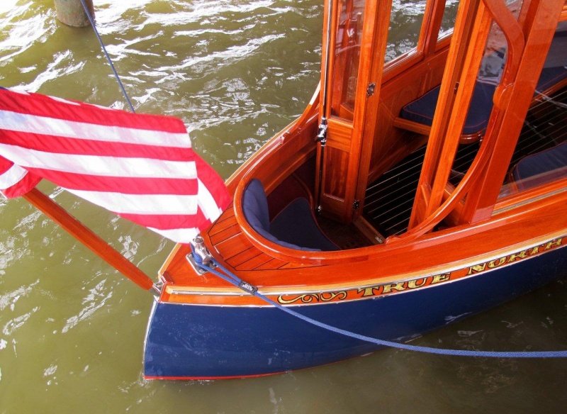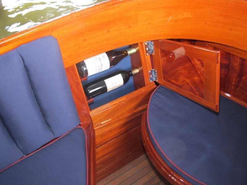 La lancha Telescope cuenta con una construcción de cabina excepcional. La mayor parte del marco es de canal de aluminio, completamente oculto con caoba barnizada maciza. Los canales de aluminio permiten que las grandes ventanas laterales de vidrio biselado desciendan hacia el casco, lográndose así una mayor ventilación durante clima cálido.